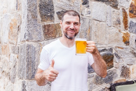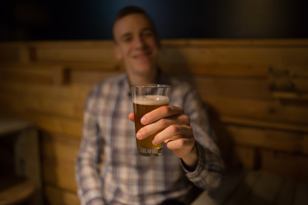 Man holds a glass of beer on blurred background.
