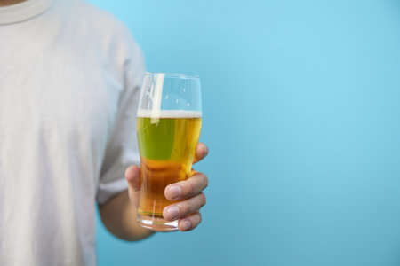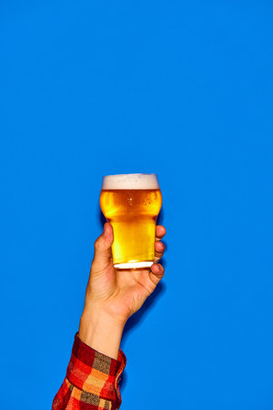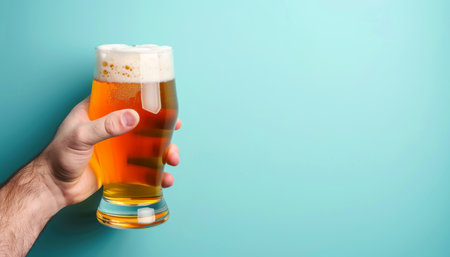 Hand holding beer glass on pastel background with ample space for text placement