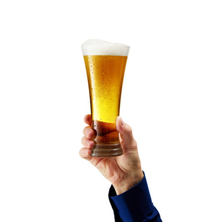 Beer glass and hand holding isolated on white.