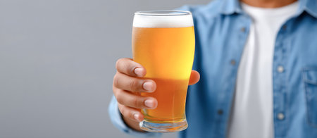 Individual presenting a glass of golden beer with foam, set against a soft gray backdrop, perfect for social occasions and toasting moments