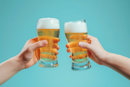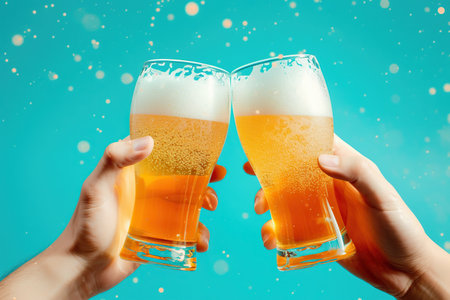 Close up of two hands clinking glasses with beer on blue background
