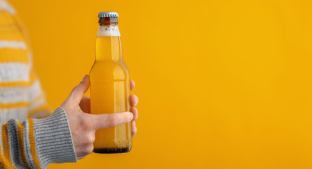 A hand confidently grips a chilled beer bottle, droplets of condensation glistening against a vibrant yellow background adorned with subtle plant elements.
