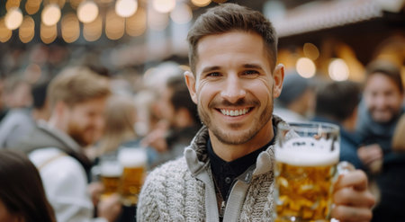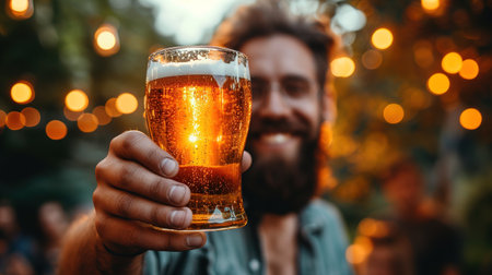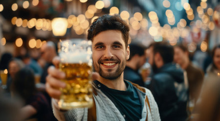 A cheerful man smiles while raising a glass of beer amidst a lively crowd at a festival in the evening. The atmosphere is warm and festive, with twinkling lights in the background.