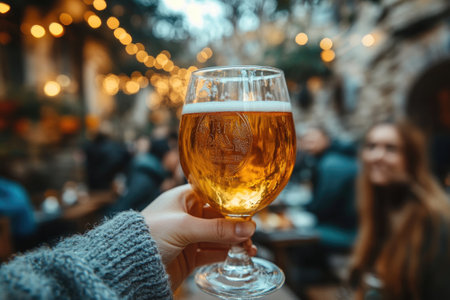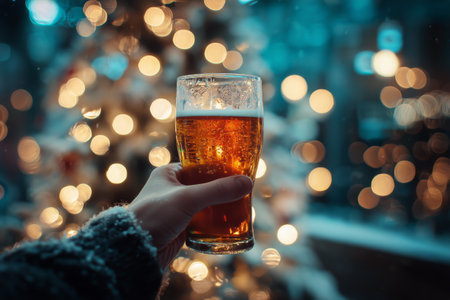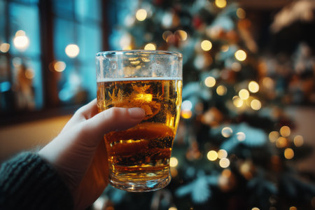 A person raises a glass of golden beer, surrounded by twinkling lights and a beautifully decorated tree, celebrating the holiday spirit in a cozy atmosphere..