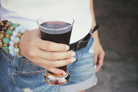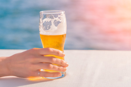 A glass of fresh, cold beer in women s hands