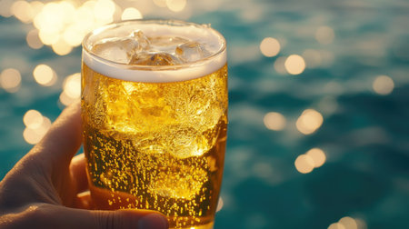 Beer mug in hand with sea background / hand holding a mug of beer on beach in summer hot weather ocean landscape nature outdoor vacation
