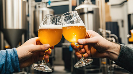 Two friends clinking glasses of craft beer at a brewery, with brewing equipment visible in the background.