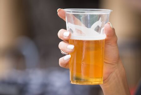 Fresh beer in a plastic cup in the hand .
