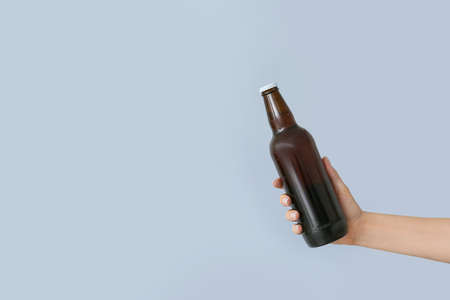 Hand with bottle of beer on gray background