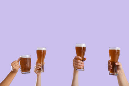 Two glasses of beer in hands on a blue background. Close-up