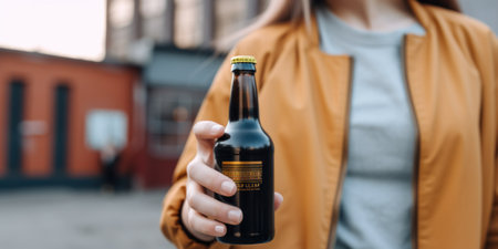 A woman holding a bottle of beer in her hand. Generative AI image.