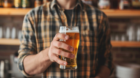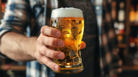 Refreshing Moments: Bartender Holding a Freshly Tapped Glass of Beer with Ample Copy Space. Generative AI