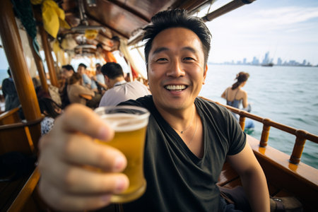 Photograph of [ asian man taking a selfie with beer on the boat, candid shots of famous figures, light amber and amber, carnivalesque, wide lens, sharp focus ], candid shot , ultra high definition, natural lighting, 85mm --ar 3:2 --v 5.2 Job ID: d7571d19-84d5-4111-98c9-0f83645dcb5f