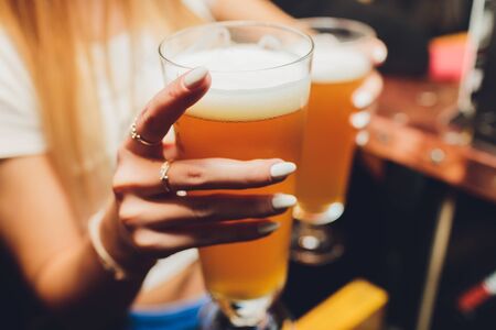 Close-up view of a two glass of beer in hand. Hands Clinking Glasses of Beer.