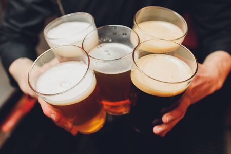 Close up of group of people clinking glasses with beer at pub