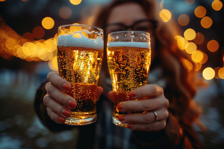 Two glasses of golden beer are raised, sparkling under twinkling lights during a relaxed evening celebration.