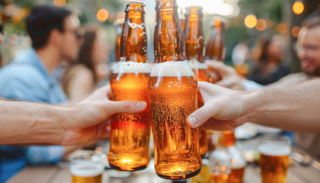Celebration of beer culture with hands holding bottles
