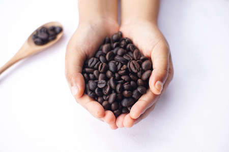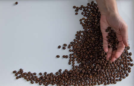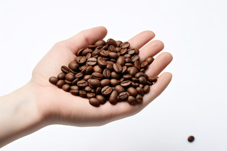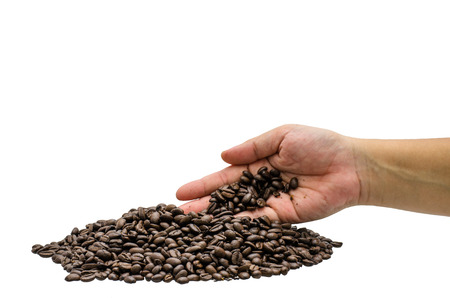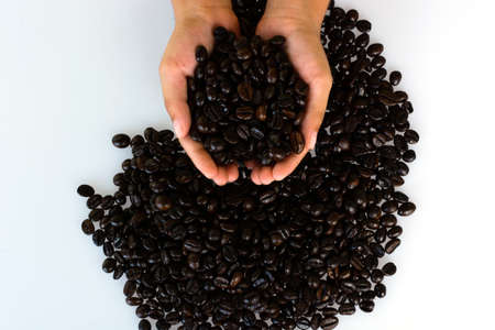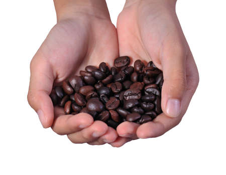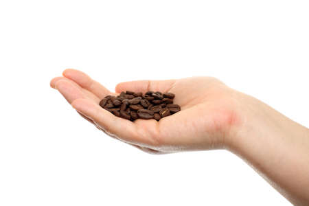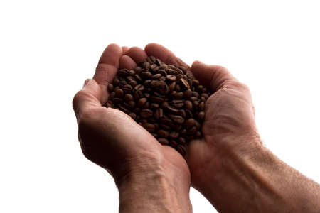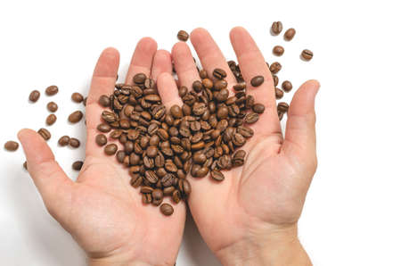 Coffee beans in hand isolated on white background. Roasted coffee beans.