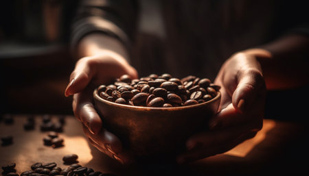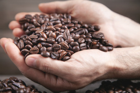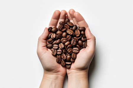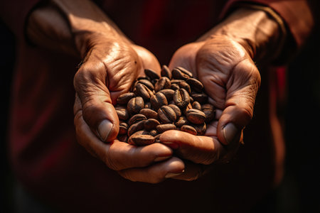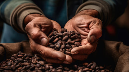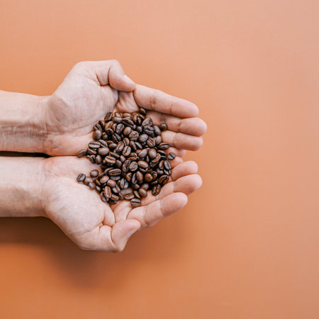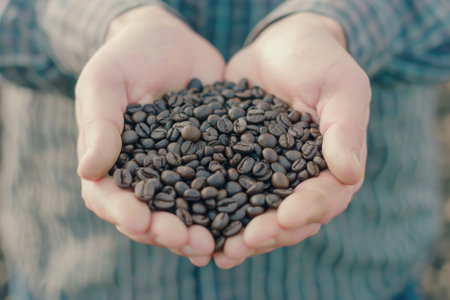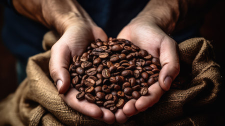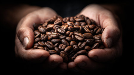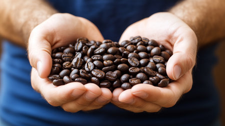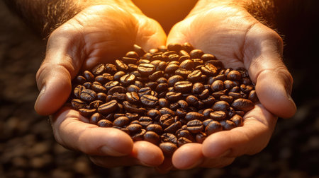 A close-up view of hands holding fresh coffee beans, symbolizing the warmth and richness of coffee culture. Perfect for food and agriculture themes.