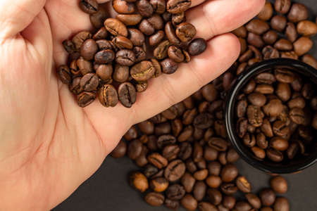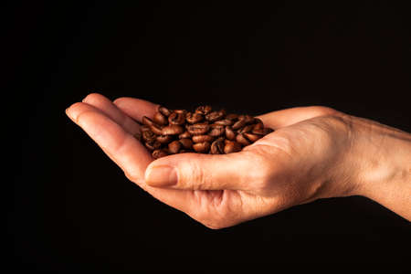 Natural brown coffee beans. Poured into the palm of the hand. Glossy color and metallic luster. Picture on a black background.