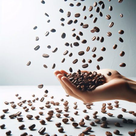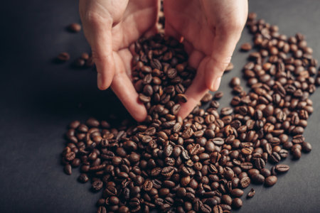 Real person hand holding a hand full of whole roasted coffee beans scattered coffee beans in the background