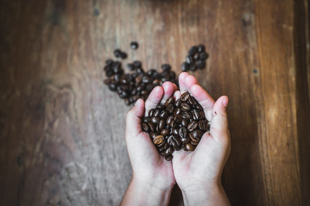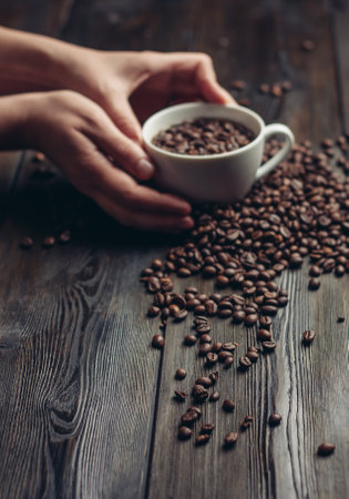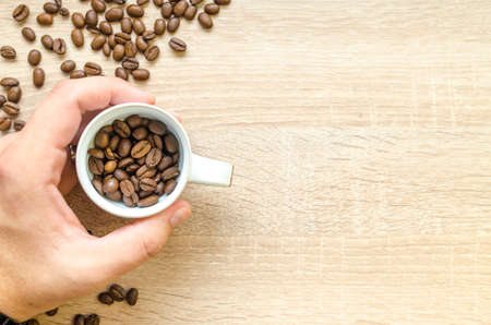 Selective focus of hand holding a cup full with coffee beans on wooden background.