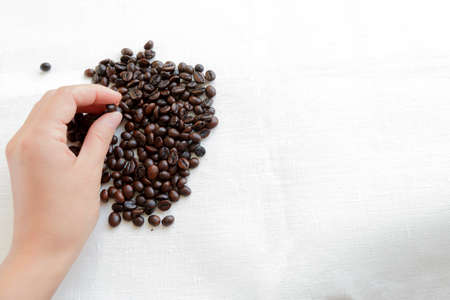 Coffee beans on a black background. Woman's hand and keep beans. Hot drink. Close up.