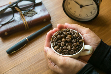 Selective focus of a hand holding a cup full with coffee beans ,pen, notebook, glasses and alarm clock on wooden background.