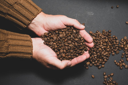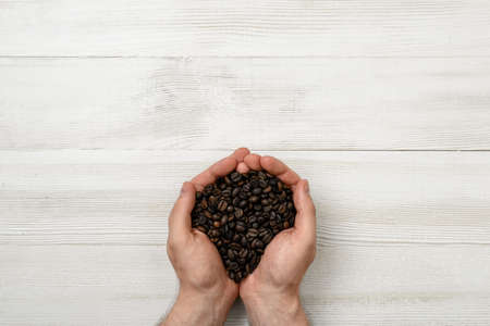Close-up hands of man holding a handful of coffee beans. Top view composition. Workplace coffee maker. Top view. Coffee house. Uplifting mood. Coffee break.