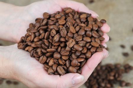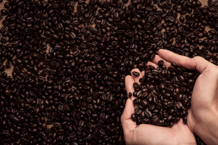 Coffee beans in hand. Coffee shop background. Coffee beans in hand.