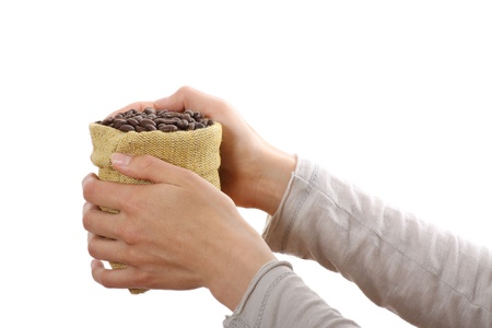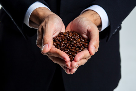 Businessman's hands holding fresh roasted coffee beans isolated on white background