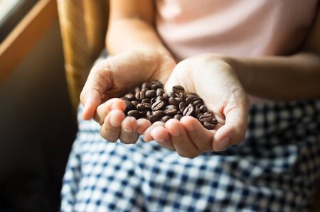 Coffee beans in hand. Coffee shop background. Roasted coffee beans