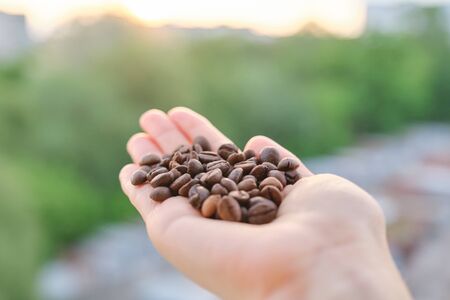 Coffee beans of quality roasted coffee in a man hand, selective focus.