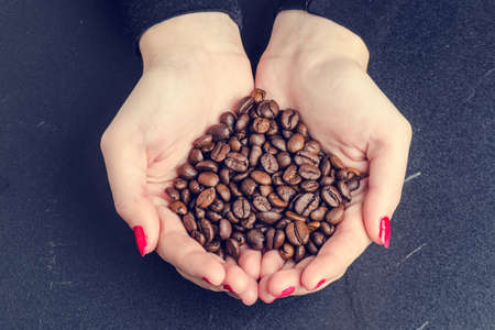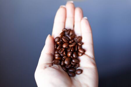 Female hand hold roasted coffee beans. Woman palm with coffee beans