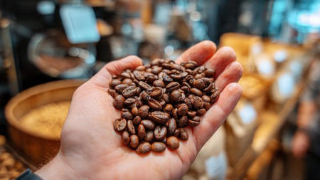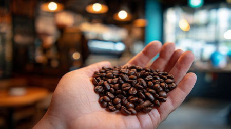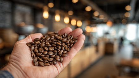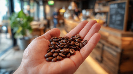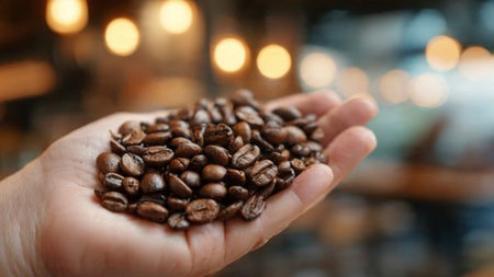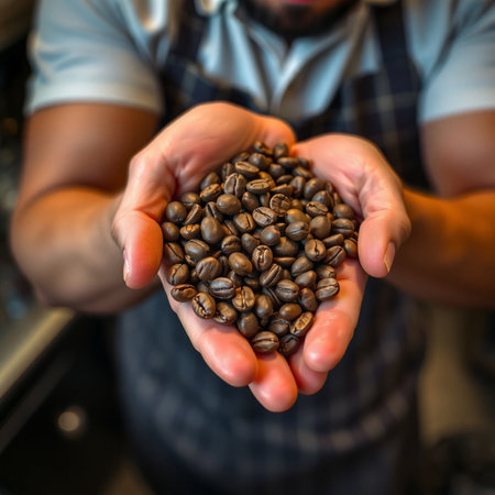 Close-up of barista holding freshly roasted coffee beans, showing the quality and aroma of the coffee