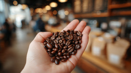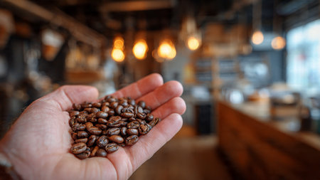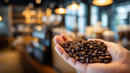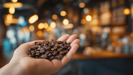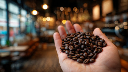Coffee beans in hand on blurred background of coffee shop with bokeh
