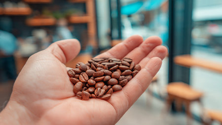 Coffee beans in hand, coffee shop blur background, coffee shop concept