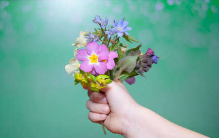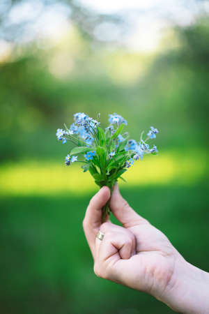 Spring flowers. Forget-me-not flowers in a hand. Scorpion grasses.