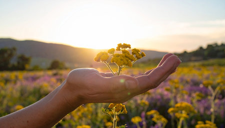 A hand holds yellow yarrow flowers in a field of purple and yellow blooms at sunset.