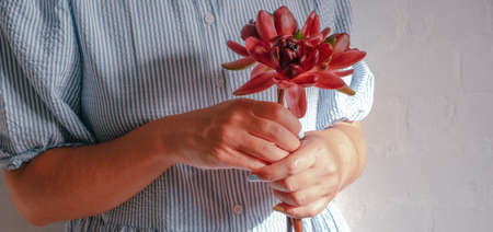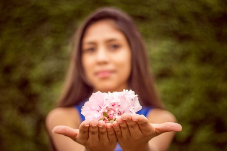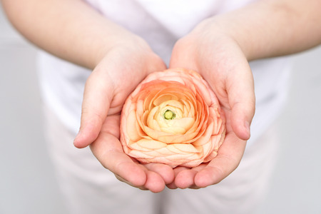 Women's hands stretch out delicate flower. Concept of psychology of relationship.