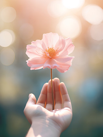 Volunteering and Compassion: Hand Holding Two Flowers at Dusk Reflecting Peaceful Unity.