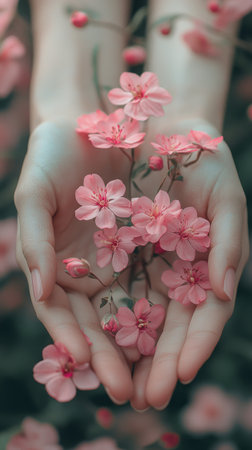 Soft hands gently cradle a cluster of pink blossoms, showcasing their vibrant colors against a lush green backdrop under natural daylight.