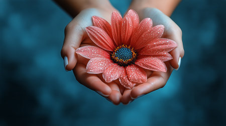 Two hands delicately hold a vibrant pink flower adorned with dewdrops, creating a serene and refreshing visual contrast against a soft blue backdrop.