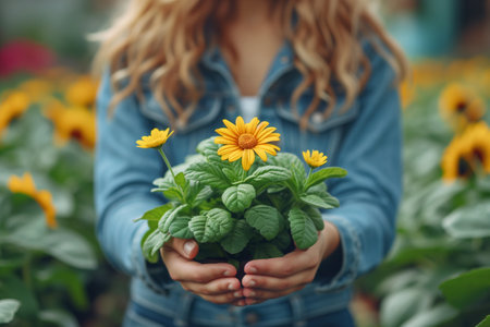 Nurturing female gardener holding a blooming yellow gerbera flower. Generative AI