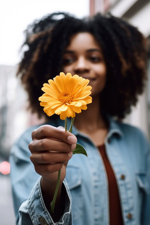 portrait of a young beautiful African American girl with a flower of daisy in her hand