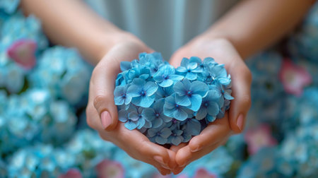 Mother's Day. A woman's hands holding blue flowers in the shape of heart, pastel aesthetic, stock photo, feminine colors, high resolution photography