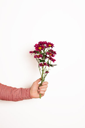 Purple or burgundy chrysanthemum in a male hand on a white background close-up. Concept os relationship or st valentine's day or dating or womens day. copyspace.