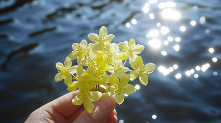 A hand gently holds a cluster of bright yellow flowers, creating a striking contrast against the shimmering water surface and soft sunlight reflections, capturing the essence of nature's beauty.