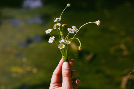 Bouquet of white daisy flowers in woman hand against green water in a river, pond. Woman and wildflowers. Daisies bunch close-up shot. summer nature