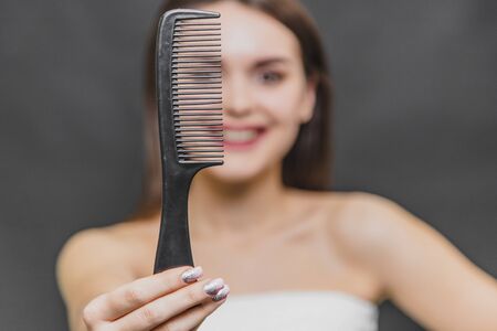 Close-up hands cleaning a comb from hair. Girl and hairbrush on the black background. Hair problems concept. Copy space.